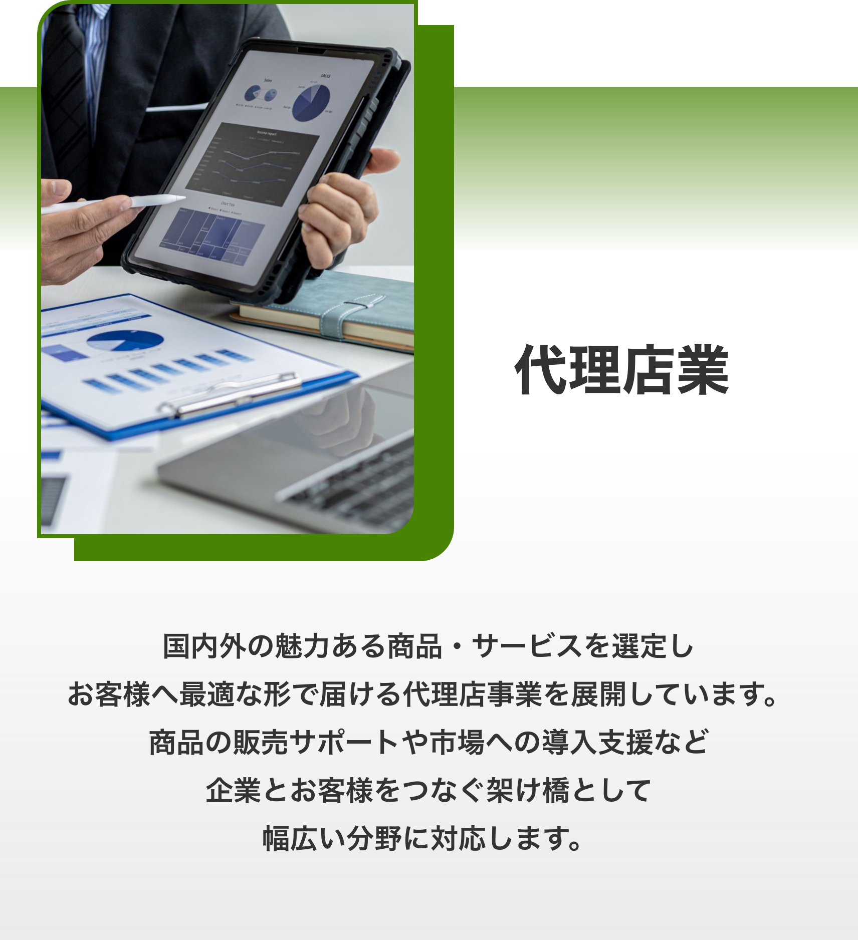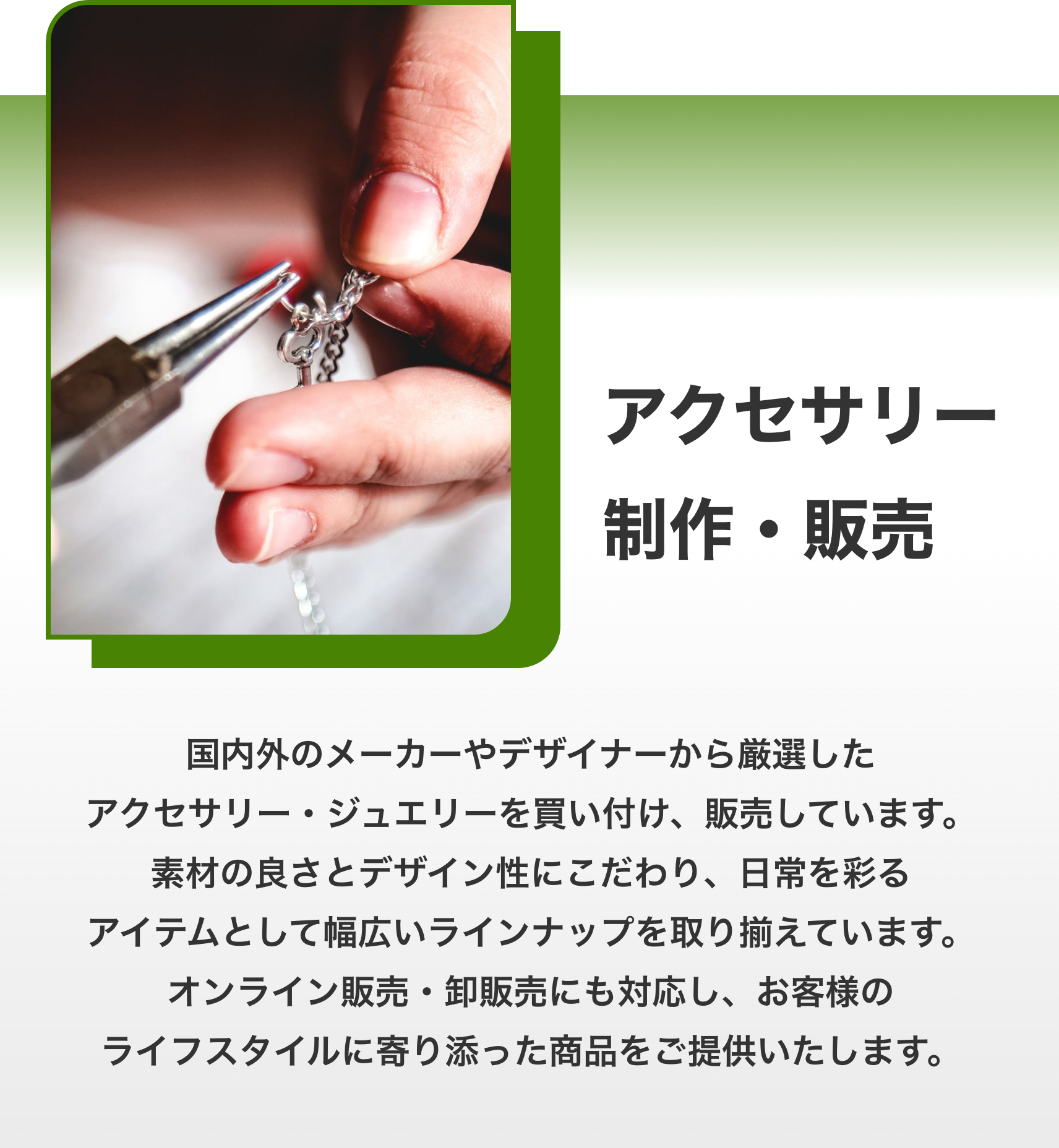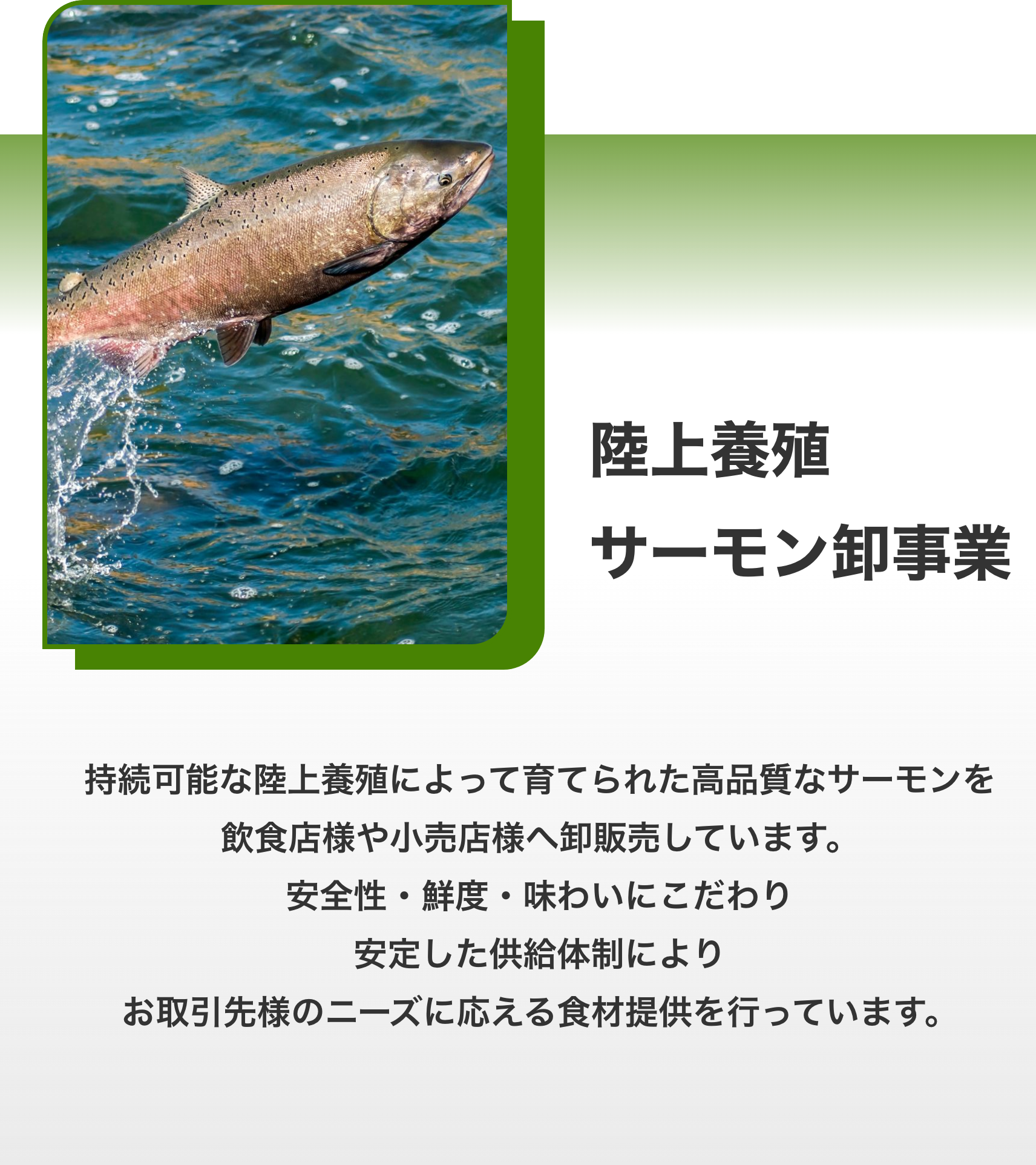 事業内容 Service 事業内容 Vision 私たちは、陸上養殖サーモン卸、代理店業、アクセサリー制作販売という多様な事業を通じて、お客様にとって“安心して選べるサービス”を提供し続けることを目指しています。食・商品・ものづくり・といった異なる分野でも、「品質へのこだわり」「誠実な対応」「地域への貢献」を共通の価値として、より良いサービスづくりと持続的な成長を追求していきます。多角的な事業の強みを活かしながら、時代に合わせて新しい価値を創造し、地域の皆さまに信頼される企業であり続けることが私たちのビジョンです。 アクセサリー制作・販売 国内外のメーカーやデザイナーから厳選したアクセサリー・ジュエリーを買い付け、販売しています。素材の良さとデザイン性にこだわり、日常を彩るアイテムとして幅広いラインナップを取り揃えています。オンライン販売・卸販売にも対応し、お客様のライフスタイルに寄り添った商品をご提供いたします。 陸上養殖サーモン卸事業 持続可能な陸上養殖によって育てられた高品質なサーモンを飲食店様や小売店様へ卸販売しています。安全性・鮮度・味わいにこだわり安定した供給体制によりお取引先様のニーズに応える食材提供を行っています。 代理店業 国内外の魅力ある商品・サービスを選定しお客様へ最適な形で届ける代理店事業を展開しています。商品の販売サポートや市場への導入支援など企業とお客様をつなぐ架け橋として幅広い分野に対応します。
